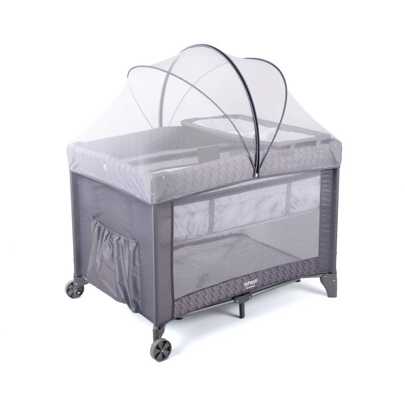 Possui duas opções de altura, que contemplam as diferentes fases da criança (quando consegue e quando não consegue sentar-se sozinha). Possui bolso porta-trecos, mosquiteiro arcado e trocador, sendo completo para atender as diferentes necessidades.