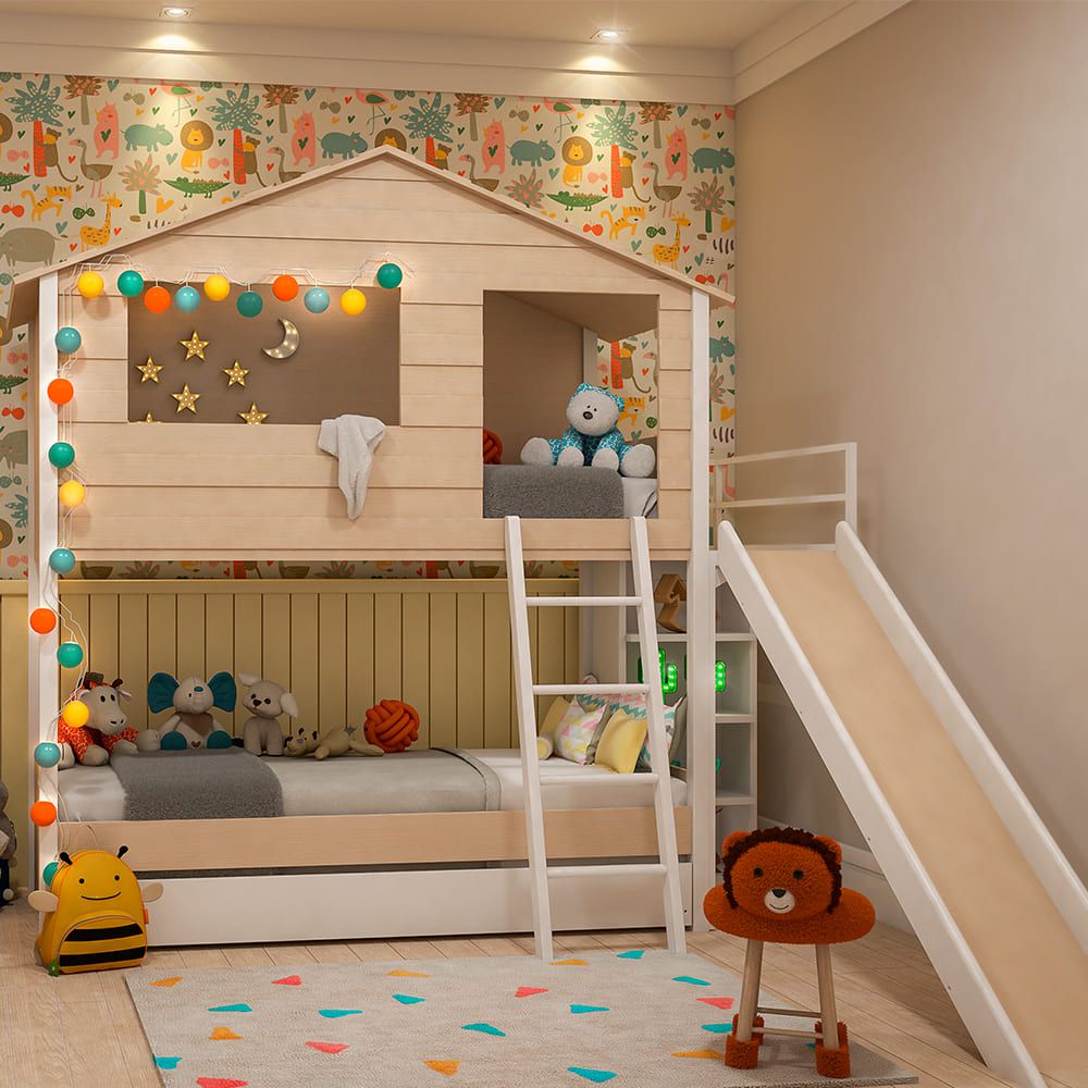 Solte a imaginação das crianças todos os dias com o Beliche Montessoriano Açai que traz uma casa na árvore alta como um açaizeiro.