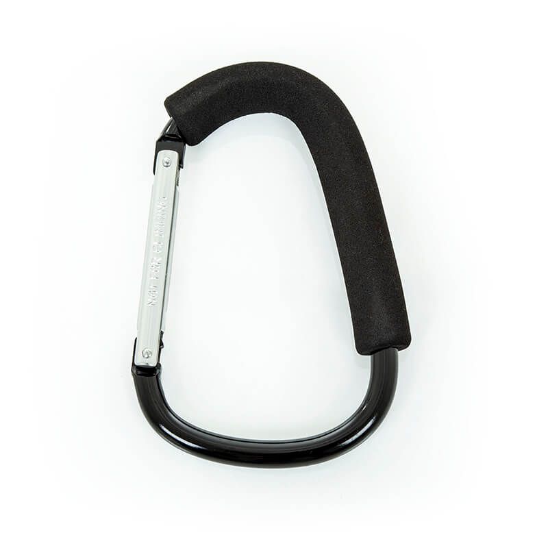 Tem fechamento em clipe (tipo mosquetão), podendo ser acoplado em diferentes manoplas, deixando as mãos livres para conduzir o carrinho. O reforço emborrachado evita atrito direto do metal com a manopla e também torna mais confortável para carregar simultaneamente várias sacolas com a mão!