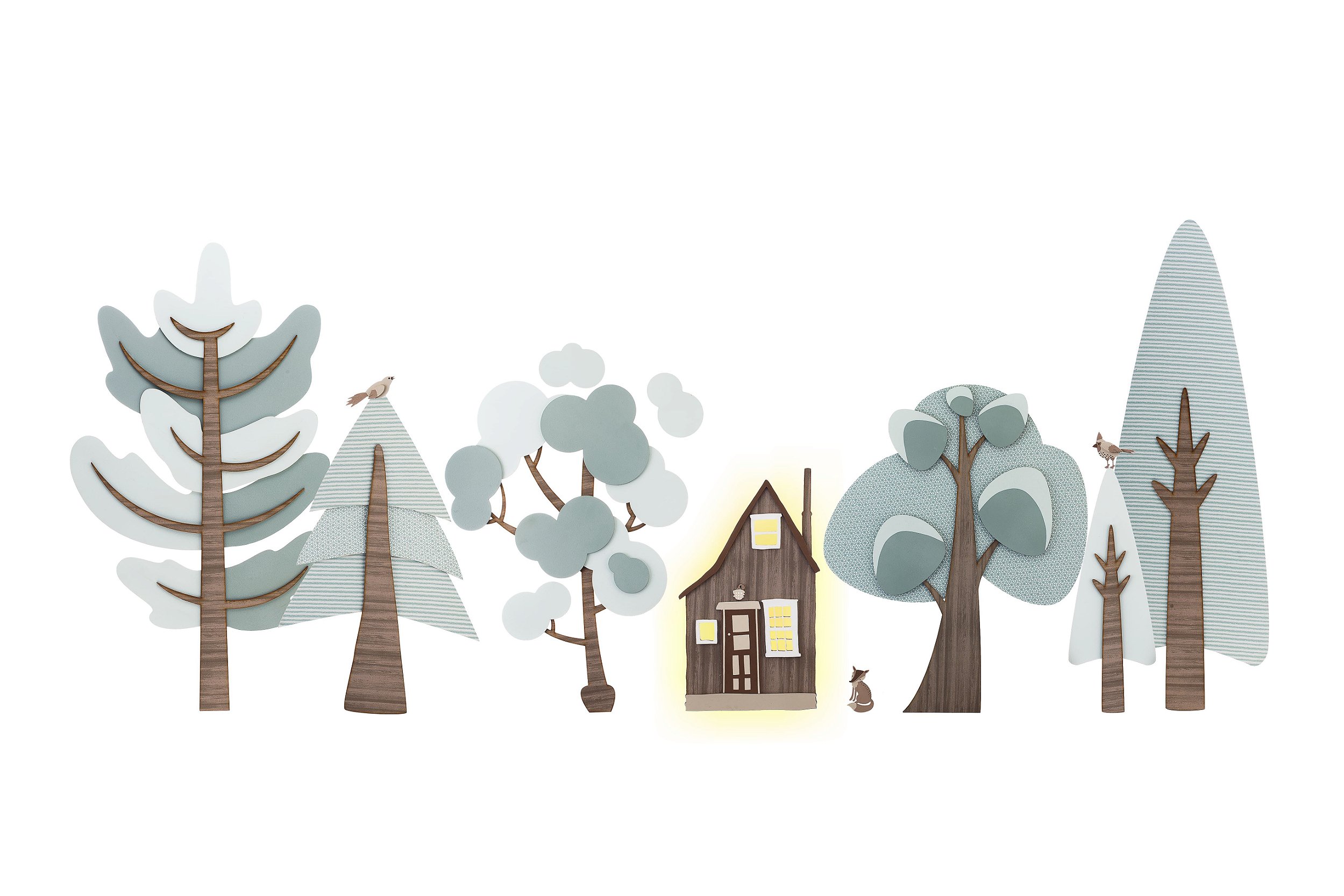 Painel conta com árvores trabalhadas em madeira ; 01 casinha com led.